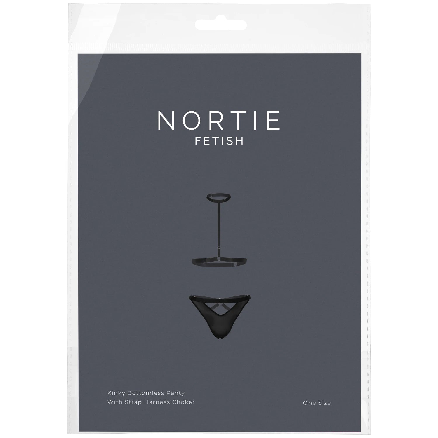 Vær kinky med NORTIE i en sexy truse med åpen bak og en strap harness choker.